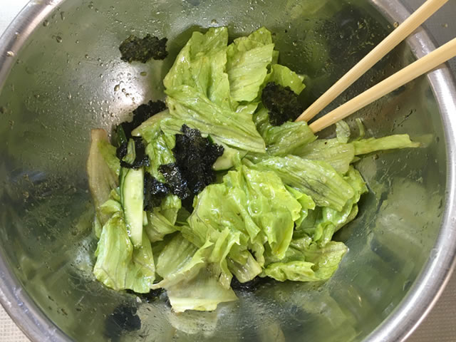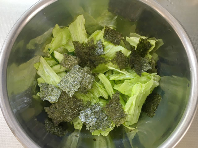 ボウルに良く水気を切ったレタスときゅうりを入れて、焼きのりを一口大にちぎって入れます。