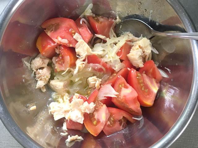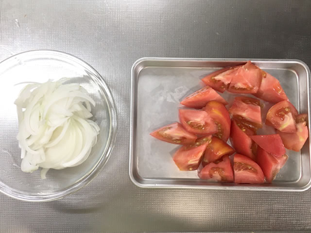 トマトは食べやすい大きさにカットし、新玉ねぎは薄くスライスしたものを塩を振って揉み、10分ほど置いておきます。