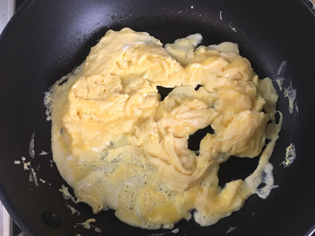 フライパンにサラダ油を引き、とき卵を流し入れて、大きく混ぜて半熟の炒り卵を作ります。