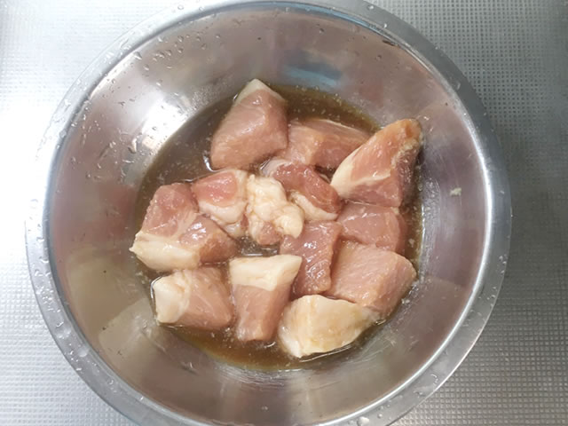 豚肉は大きめの一口大に切り、ボウルに入れて合わせ調味料(A)を加えます。もみ込んで調味液を馴染ませて5分ほど置きます。
