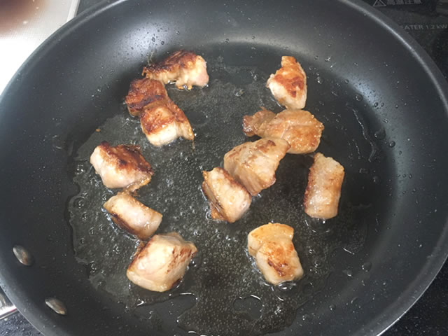 肉に片栗粉を振って全体に薄くまぶしつけ、フライパンにサラダ油を入れて中火でじっくり揚げ焼きにします。