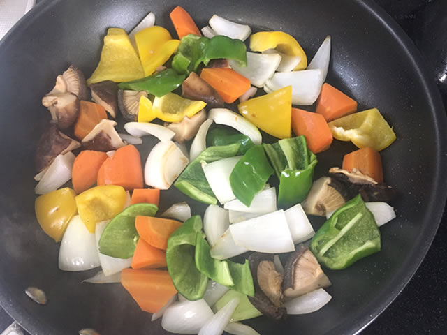 少し油を残してキッチンペーパーでフライパンを拭き、野菜を入れて炒め合わせます。