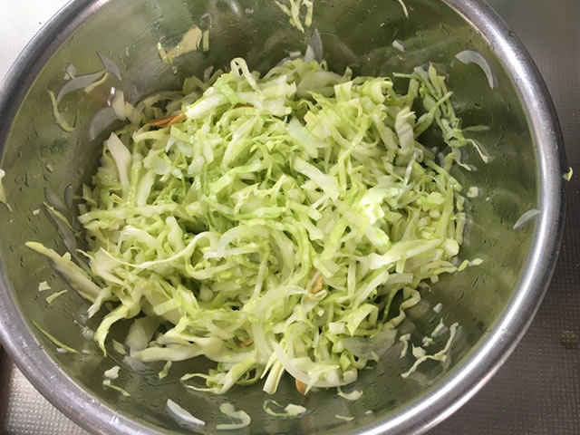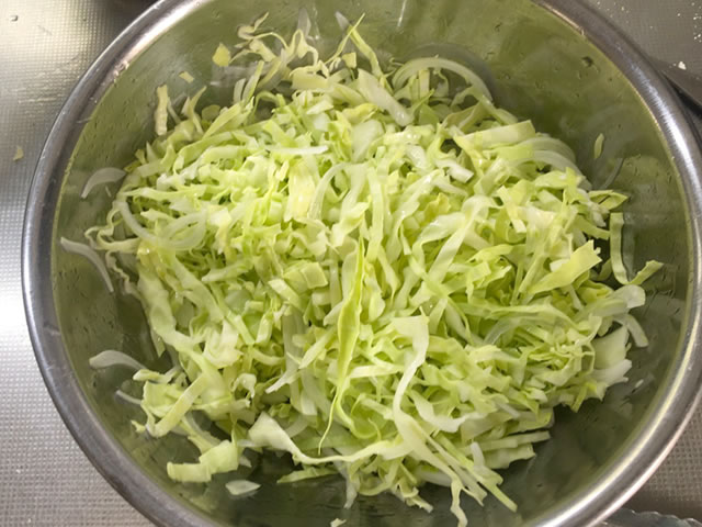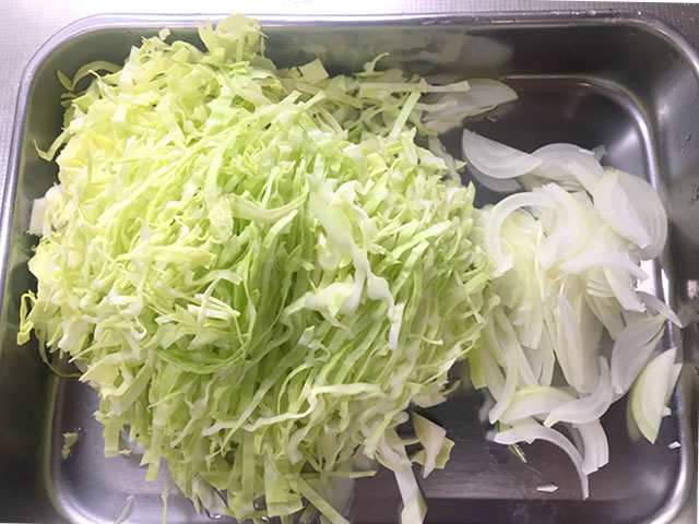 キャベツは細切りにし、玉ねぎは薄く切っておきます。