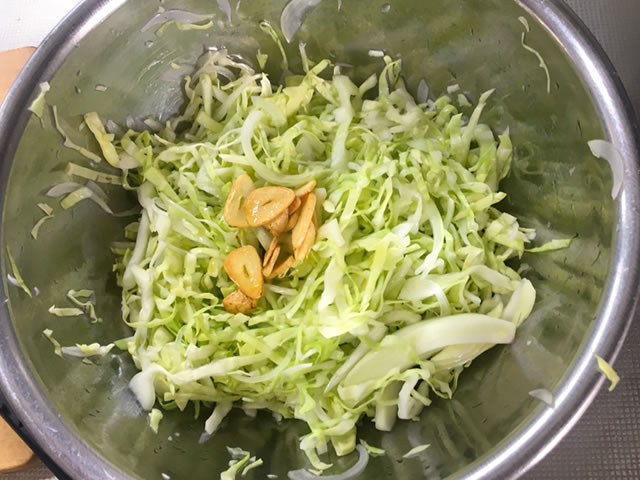 にんにくの良い香りがしたら火を止めて、熱いうちにキャベツにかけます。