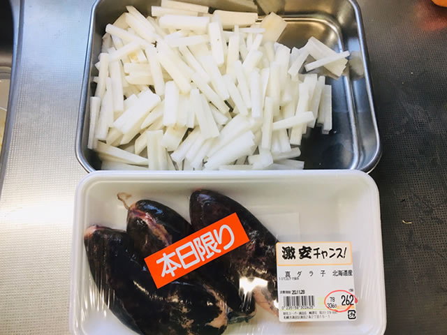 さとちゃんが買い出し中に見つけた特売のたらこと、長沼で記録班が買ってきた大根を使って♪