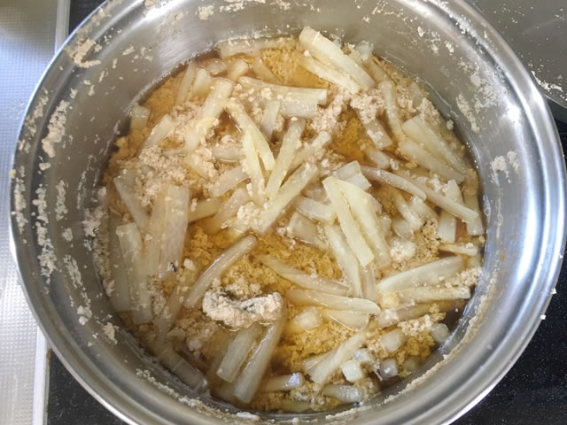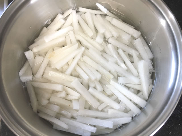 鍋に大根と水を入れて火にかけます。水は目安として400ccとしていますが、写真のように大根にかぶらない程度の少な目の水に加減しましょう。