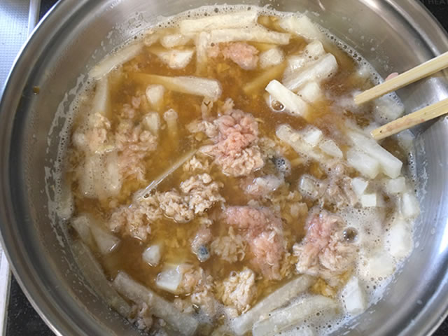 煮立ったら調味料とたらこを入れて、中火で10分間煮ます。