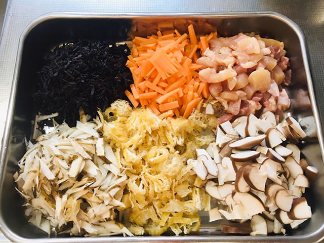 ひじきは戻しておき、ごぼうはささがき、他の具材はなるべく細かく切っておきましょう。