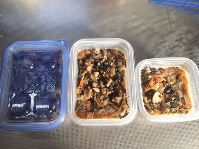 今回の作り置き用分量で500ccの密閉容器2つ(上写真の左2つの容器)、200ccの密閉容器1つ(上写真の右の容器)分ができます。