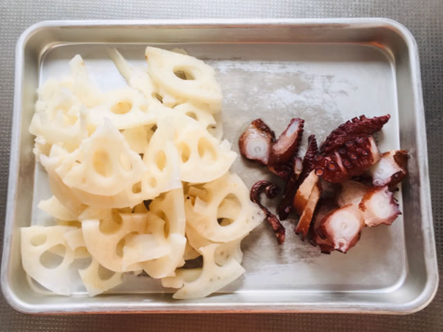 レンコンは4〜5ミリの暑さのイチョウ形に切り、タコも4〜5ミリ厚さに薄切く切ります。レンコンとタコは同じくらいの厚みになるようにしてくださいね。