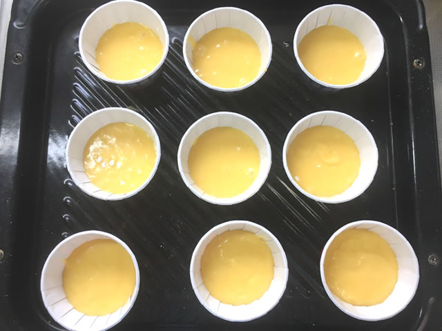 カップに6分目くらいまで生地を入れて、180℃に予熱してからオーブンで20分焼きます。