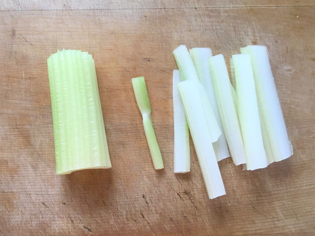 セロリはよく洗って、スジをピーラーなどで取り、5センチくらいにカットしたものを縦に千切りします。