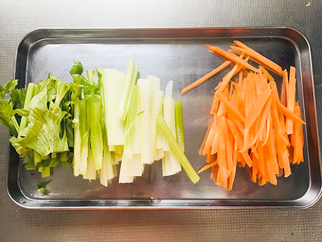 セロリの葉の部分も同じくらいの長さになるようにザク切りにして、人参は千切りにします。