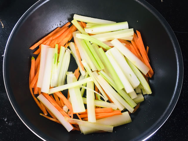 フライパンに油を熱し、セロリの茎と人参を炒めます。