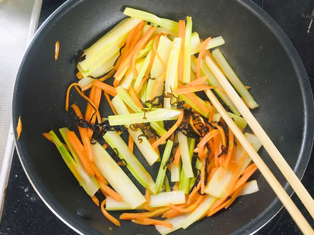 セロリが透明になってきたら塩昆布、酒を入れて、中火で炒めます。