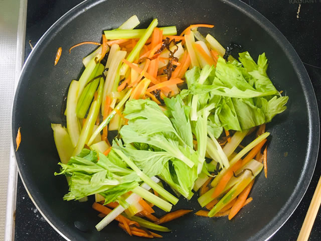 3分ほど炒めたら、セロリと人参を味見してみましょう。味見をして丁度良ければ、葉を入れて1分ほど炒めます。