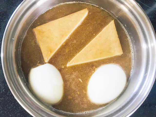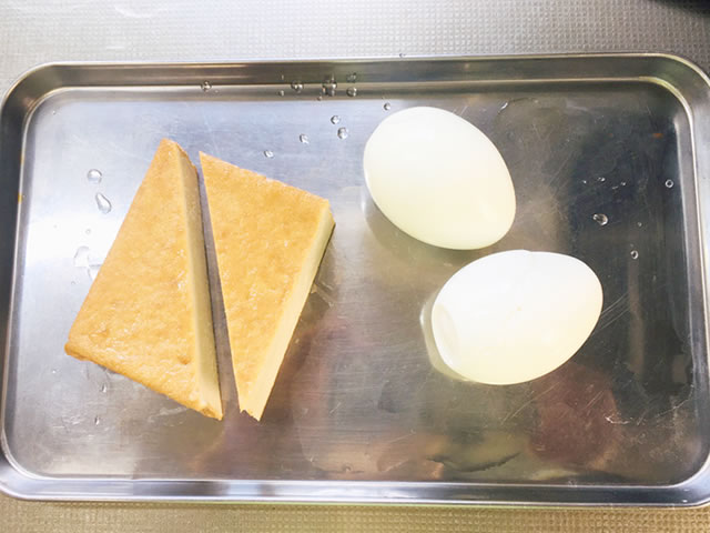 厚揚げは油抜きをせず、三角形に切り、ゆで卵はあらかじめ作っておきます。