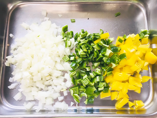 玉ねぎ、パプリカ、ピーマンは粗めのみじん切りにします。