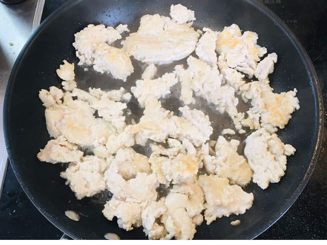 ひき肉を適当な大きさにほぐして炒めます。細かくパラパラの状態にしてしまうと水分が抜けてしまうのでパラパラに炒めないでくださいね。