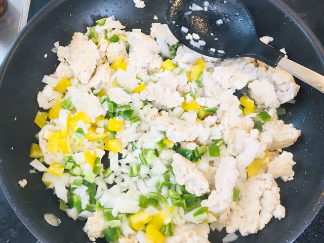 ひき肉はパラパラに炒めず、少しかたまりを残してほぐす程度に炒めましょう。