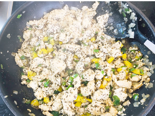 火が通ったら玉ねぎ、パプリカ、ピーマン、にんにくを入れてサッと混ぜます。