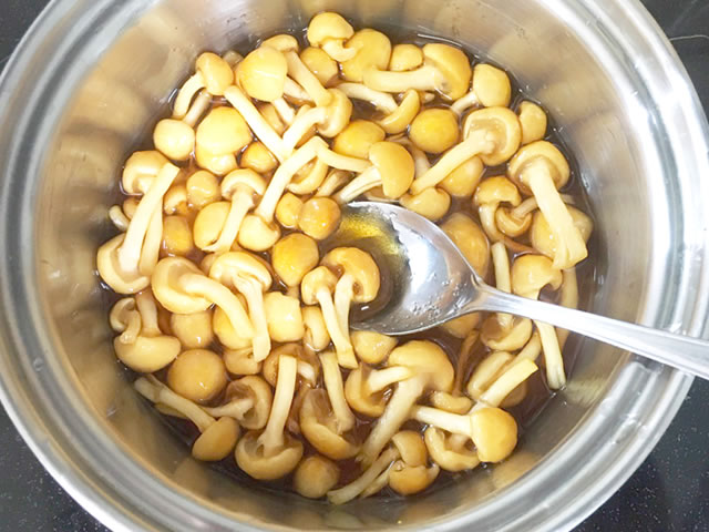 なめこは洗って、鍋に入れ、調味料も入れます。