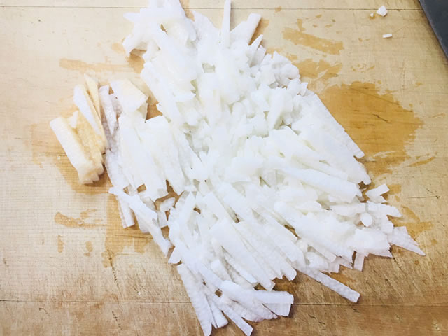輪切りにしたものを千切りにします。切った後、包丁で細かく叩くとなめこと混ぜたときになじみやすくなります。