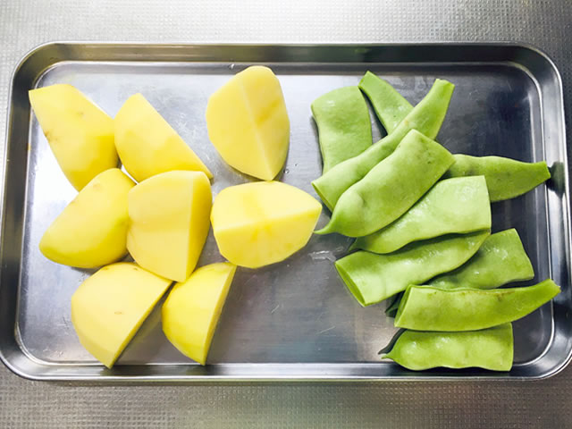 じゃがいもは食べやすい大きさに切り、モロッコインゲンは筋を取って2等分に切ります。