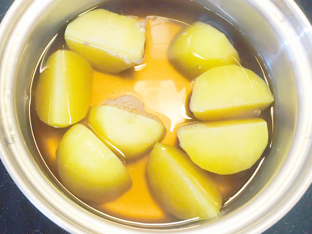 鍋に水とめんつゆ、じゃがいもを入れて火にかけます。煮立ってきたら弱めの中火にし、フタをして5分ほど煮ます。