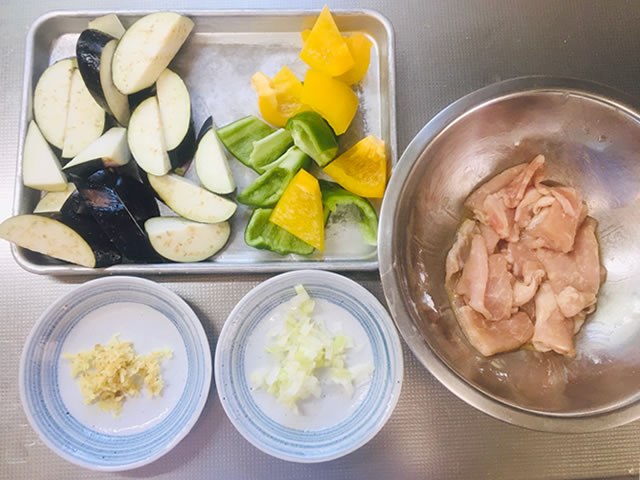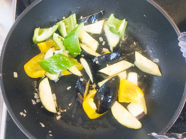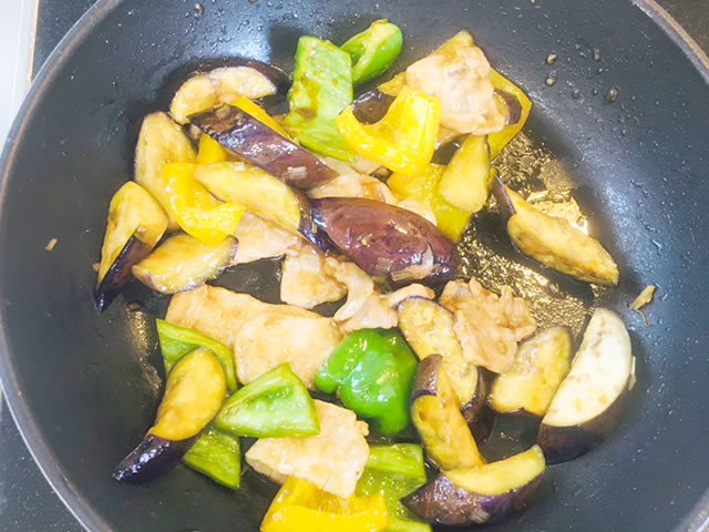 豚肉から出た油はそのままにしておき、同じフライパンでナス、ピーマン、生姜、ネギを中火で5分ほど炒めます。