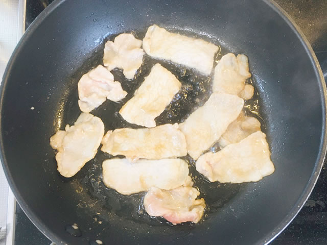 フライパンに大さじ1の油をひいて、豚肉を炒めます。豚肉に火が通ったらいったん取り出しておきます。