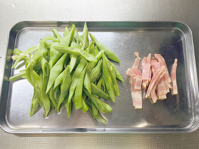 モロッコインゲンはななめ千切り、ベーコンは短冊切りにします。