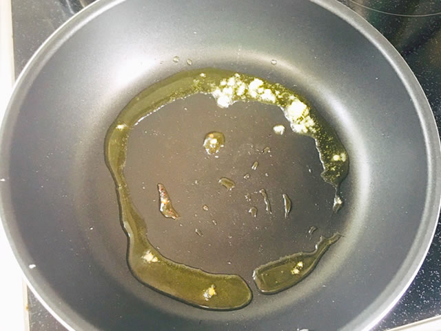 フライパンにオリーブ油をひき、みじん切りのにんにくを入れて、中火で火にかけます。