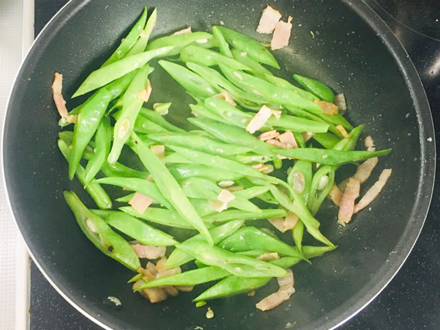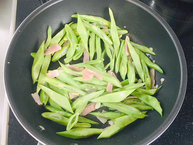 にんにくの香りがしてきたらベーコンとモロッコインゲンを入れて炒めます。