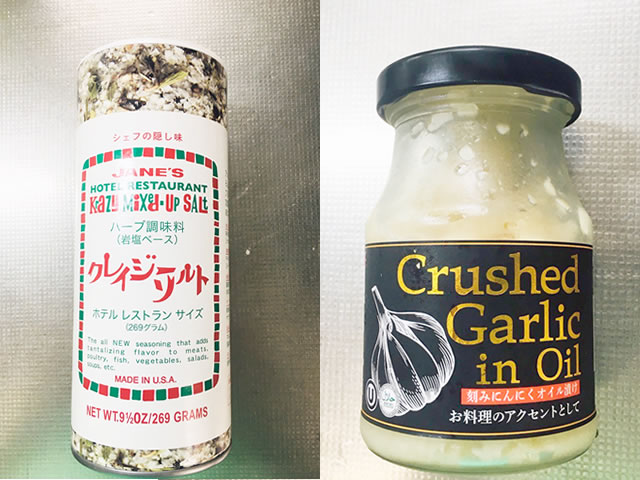 左写真が「クレイジーソルト」、右写真が「刻みにんにくオイル」。