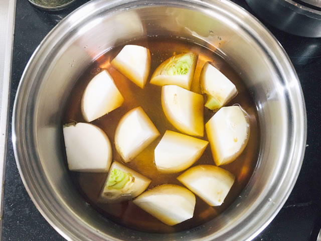 鍋に水、めんつゆ、酒、かぶを入れ、中火にかけます。