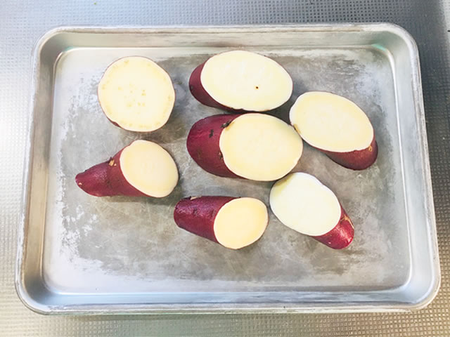 さつまいもはよく洗い、皮付きのまま3cm厚さの輪切りにして、水に約5分間さらして水気を切ります。