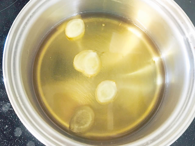 鍋にみりん、酒、醤油、生姜の薄切り5枚程を入れて、アルコールを飛ばします。
