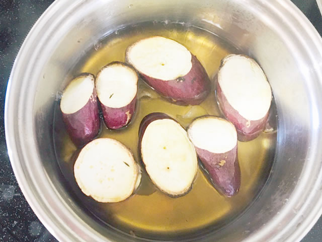 焼いたさつまいもを入れて、照りが出るまで煮詰めます。