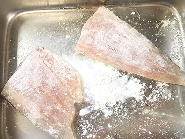 ホッケから出た水分をペーパータオルなどで軽く拭き取って、薄く薄力粉を両面にまぶします。