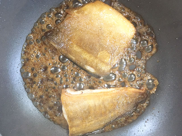 ホッケから出る余分な油を拭き取ってから混ぜておいた調味料を入れます。