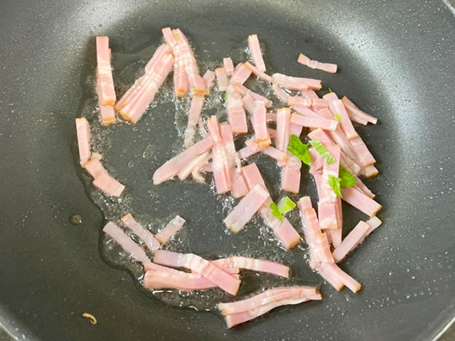 セロリの葉の香りはかなり強く、太い葉脈が通っているので生のままでは硬くて食べにくいですが、ベーコンと一緒に炒めることで爽やかな香りを楽しめる美味しい一品になるんですよ☆