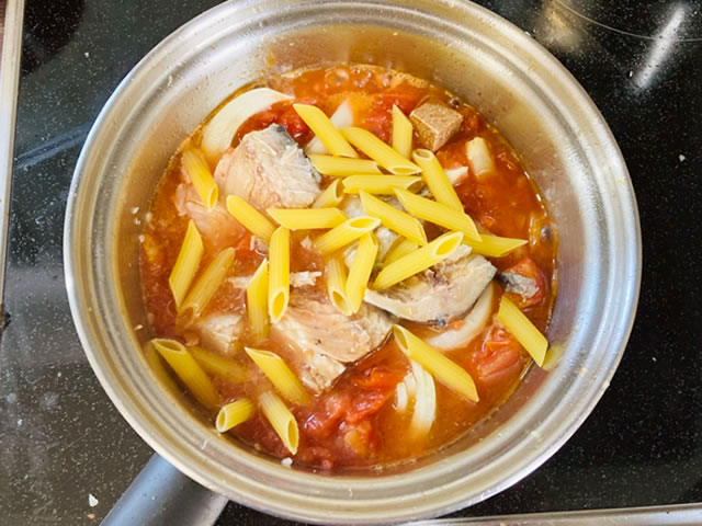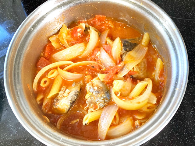 鍋にオリーブ油大さじ1を塗り、にんにくを散らした上に玉ねぎ、トマトの水煮、サバの水煮缶、スープの素、ペンネを入れて蓋をします。