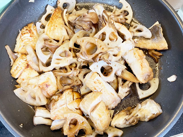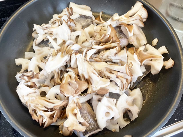 フライパンにごま油大さじ1/2を入れ、中火で熱し、ホッケと舞茸を広げた上にレンコンを乗せ、蓋をして中火で3分間蒸し焼きにします。