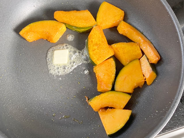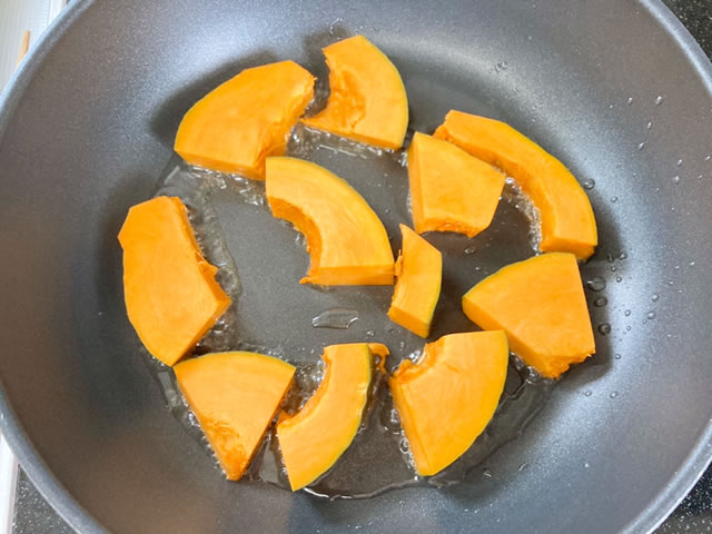 かぼちゃは1センチ程の食べやすい厚さに切りそろえ、フライパンを温めサラダ油を引き、中火でかぼちゃを揚げ焼きにします。