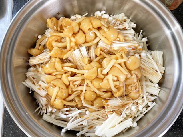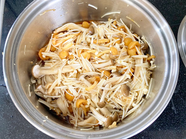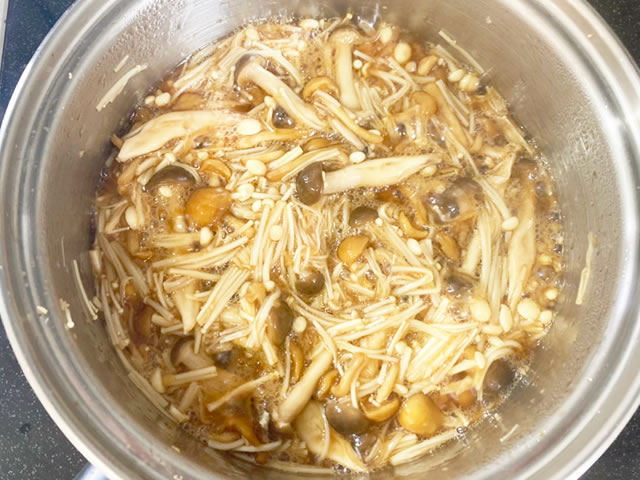 鍋に食べやすく切ったきのこと調味料を入れます。
