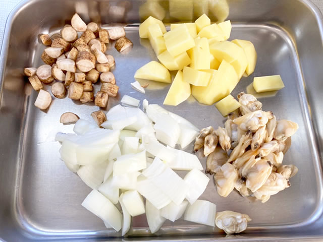 玉ねぎは1センチ四方に切り、じゃがいもは1センチ角に切ります。