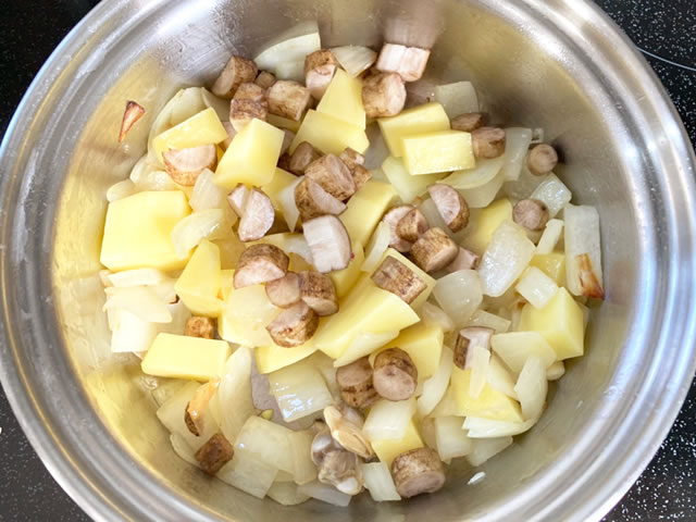 鍋にバター大さじ1、ごぼう、玉ねぎ、塩小さじ1/2を入れ、中火で炒めます。