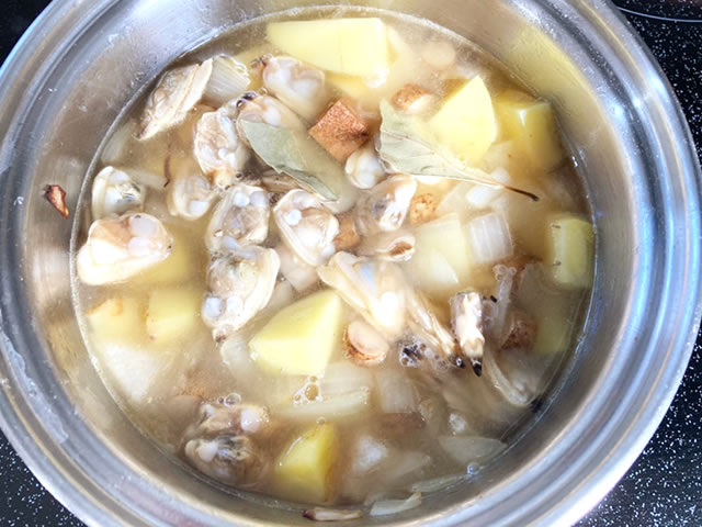 全体がアツアツになったら、じゃがいも、あさり、水100cc、スープの素、ローリエを入れ中火で10分煮ます。
