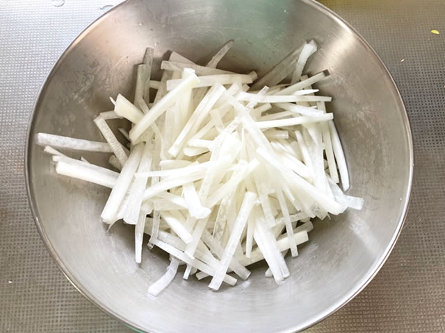 大根は皮をむいて千切りにし、塩を振ってしんなりしたら、水気をしっかりしぼります。